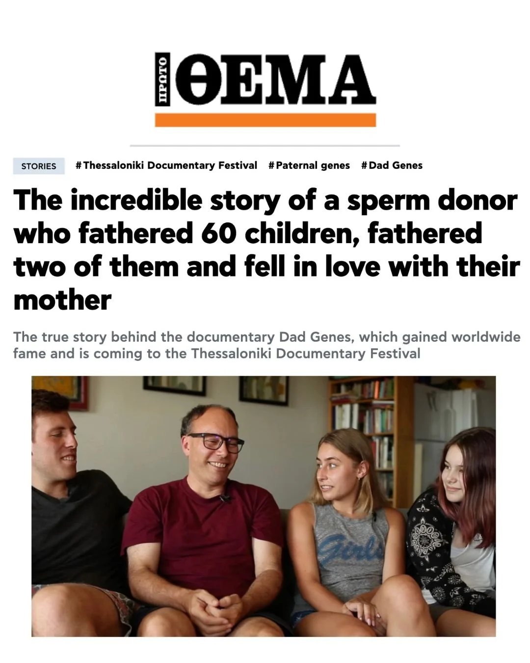 The true story behind the documentary Dad Genes, which gained worldwide fame and is coming to the Thessaloniki Documentary Festival: “A story that seems unlikely, but is absolutely true…Dad Genes doesn't just focus on the shock of the revelation or the peculiarity of the family structure…With a balance between humor, emotion and observation, the documentary explores what family means...how blood ties are redefined and what happens when nature, selection and technology meet in ways no one had predicted.”— Anna Dallari
